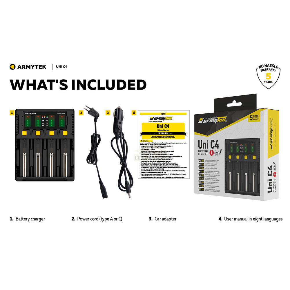 The Armytek Uni C4 is a powerful and versatile 4-slot smart charger designed for users who need maximum compatibility and control. It supports a wide range of battery chemistries and allows both automatic and manual adjustment of charging parameters.